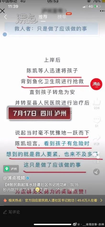 近日,四川古蔺县一孩童失足落水,有两位村民跳入河里将孩子救起,一位村民在岸上接应,帮孩子控水,最后孩子得救。可当地媒体报道却称,7月11日傍晚“社区书记跳水救人”,并详细记述了社区书记陈凯的“丰功伟绩”:我15秒内就一头扎进水中。当时看了看,周围没有别人去救,我就马上跳了下去。如果再晚几分钟,孩子就被冲到闸口,那就没法救了。对于当地媒体的报道,村民们议论纷纷:明明是王高、张洪波下水救的小孩,怎么就变成了社区书记呢?后来,事发时路人拍下的救人现场照片传到网上,引发网友的普遍关注。通过现场照片,我们能发现,只有三个人参与了救人的过程,未见社区书记。而据周围的目击者们却说,陈凯当时明明在喝酒,喝的稀里糊涂,说话都说不清楚了,怎么去救人呢?随着舆情的发酵,陈凯遭受到很大压力,他告诫村民们不要发朋友圈和抖音,不准传播未经证实的消息!一个小小的社区书记,胆敢一手遮天?也不看看这都是什么年代了!人人都可以录制视频,人人都可以拍摄照片,想以偏概全引导舆论,那简直是痴心妄想!